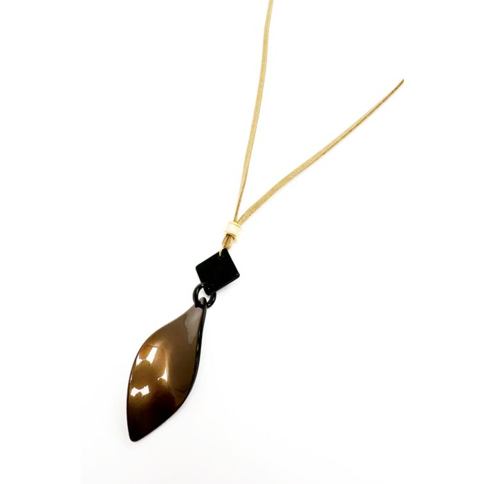Crafted with meticulous attention to detail, this necklace features a beautifully curved leaf pendant in a rich, earthy brown hue. It's convertible, so you can wear it long or short. Adjustable closure.