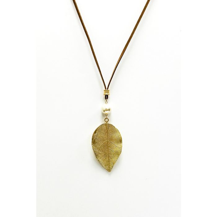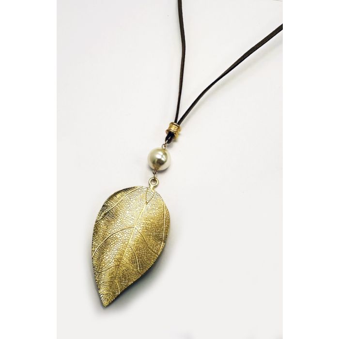 This exquisite necklace features a delicate leaf pendant plated in gold, exuding a timeless charm and sophistication. It's convertible, so you can wear it long or short. Adjustable closure.