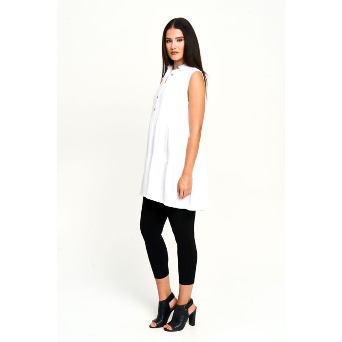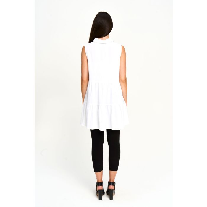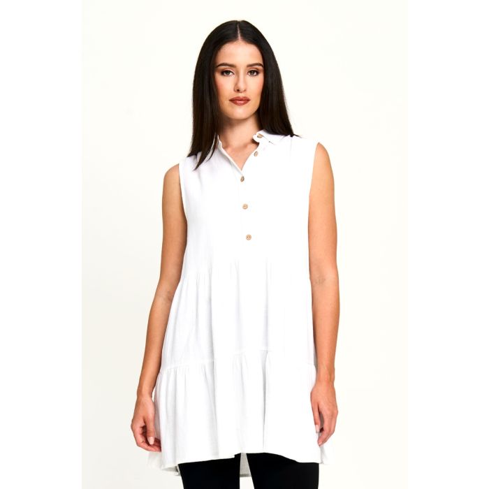 Ruffles add an extra feminine touch to our tiered tunic top. Complete the look with cute flats.